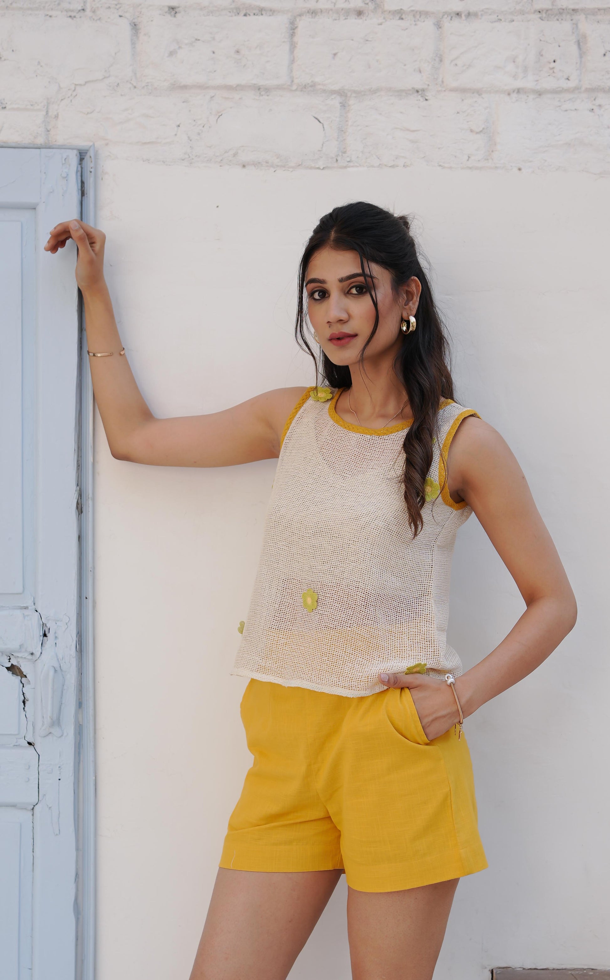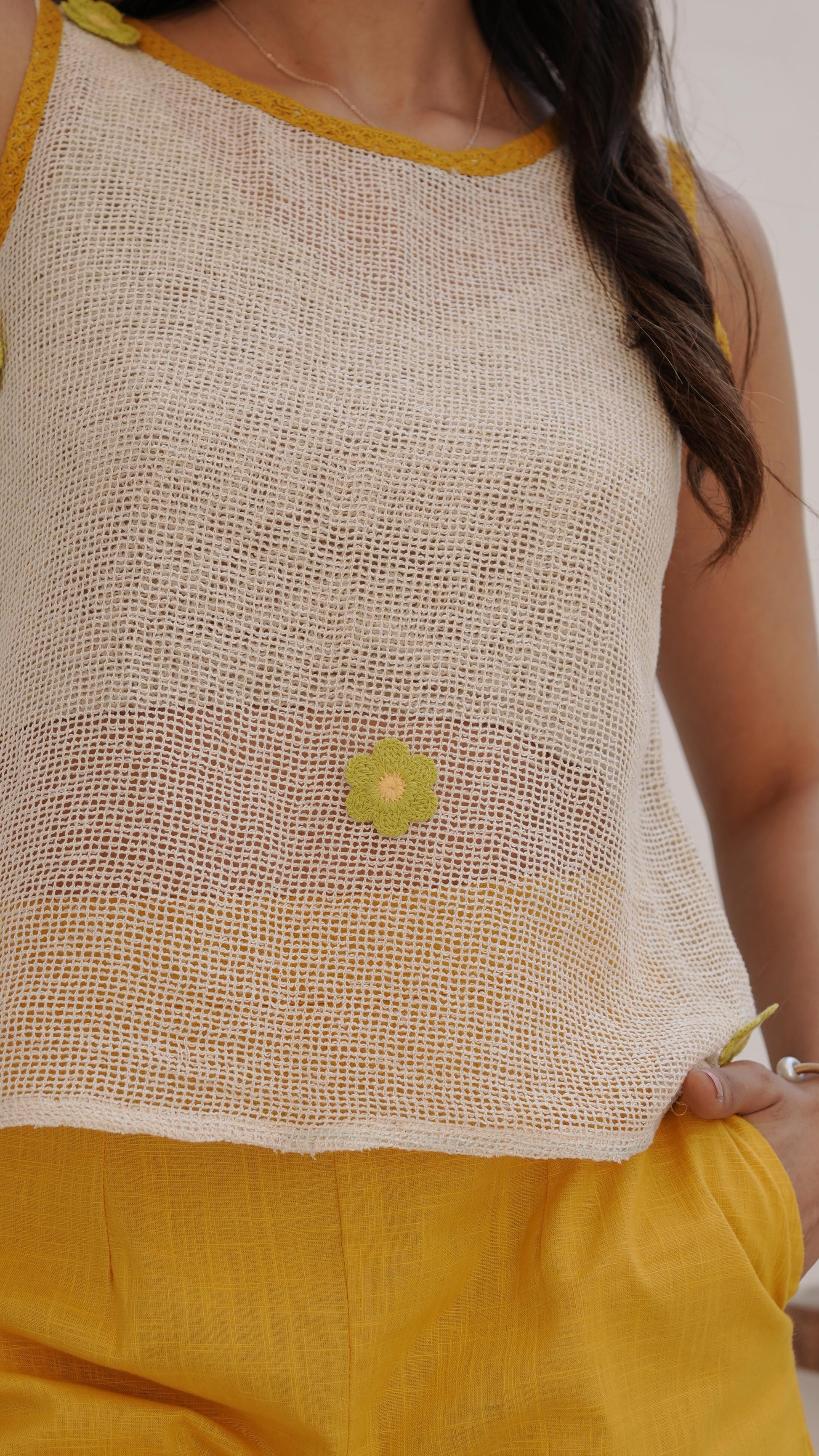 Blending neutral tones with a hint of boldness, this Off-White Mustard Lace Top is crafted from breathable cotton and finished with delicate lace accents in a rich mustard hue. Designed for comfort and effortless style, it's a perfect pick for sunny days, casual outings, or layering under jackets and shrugs.